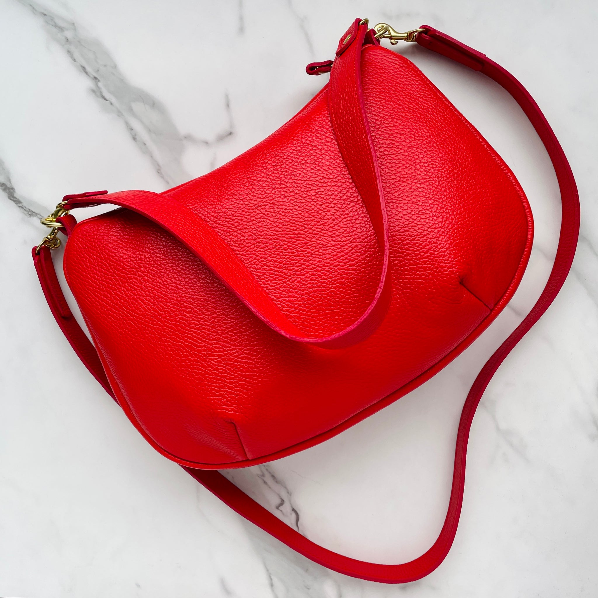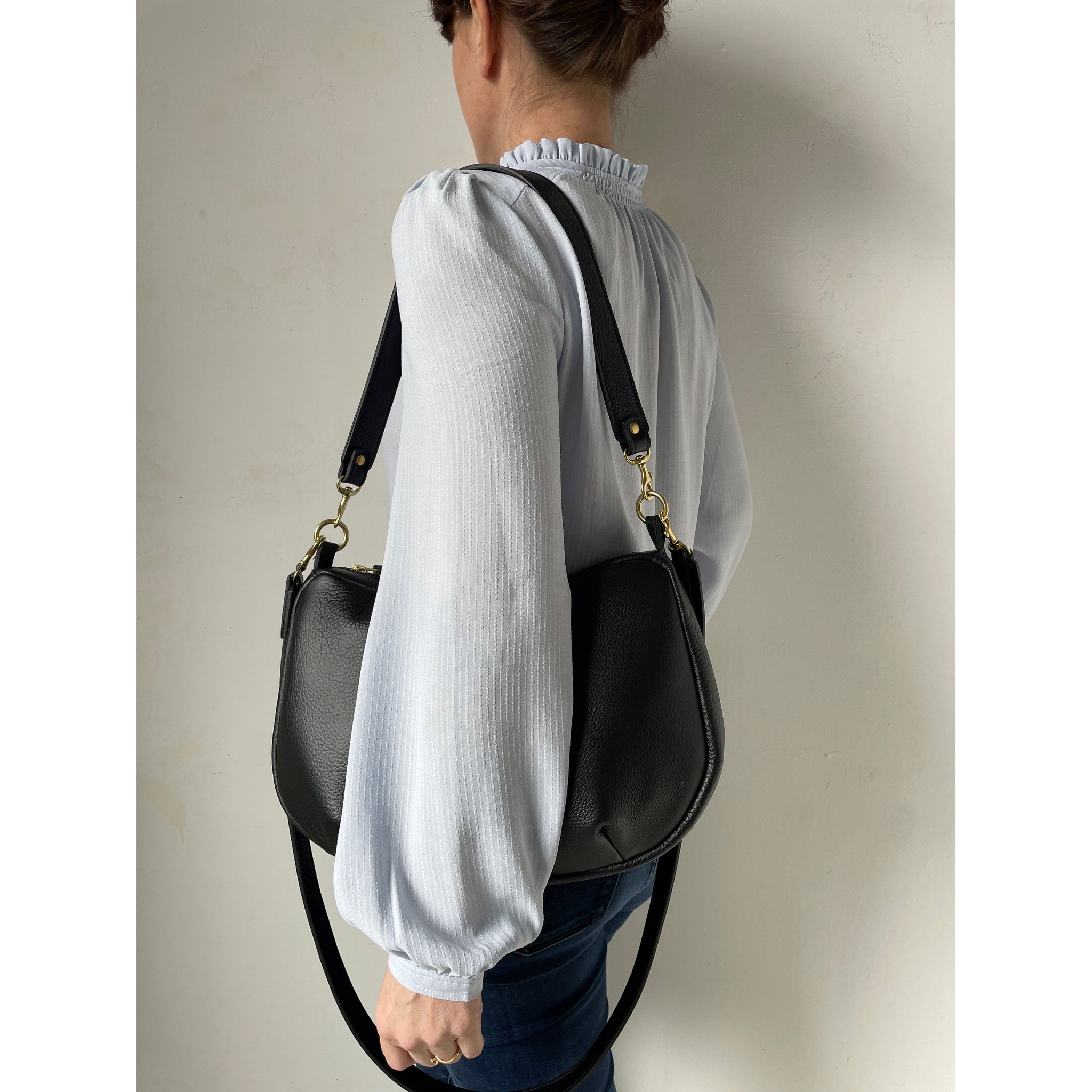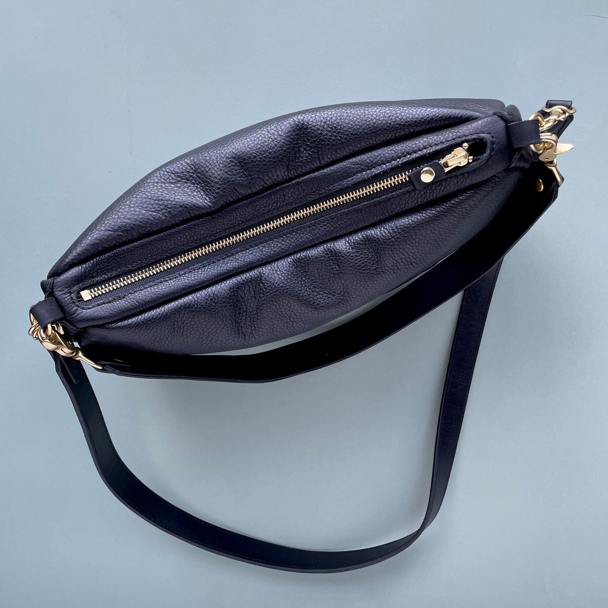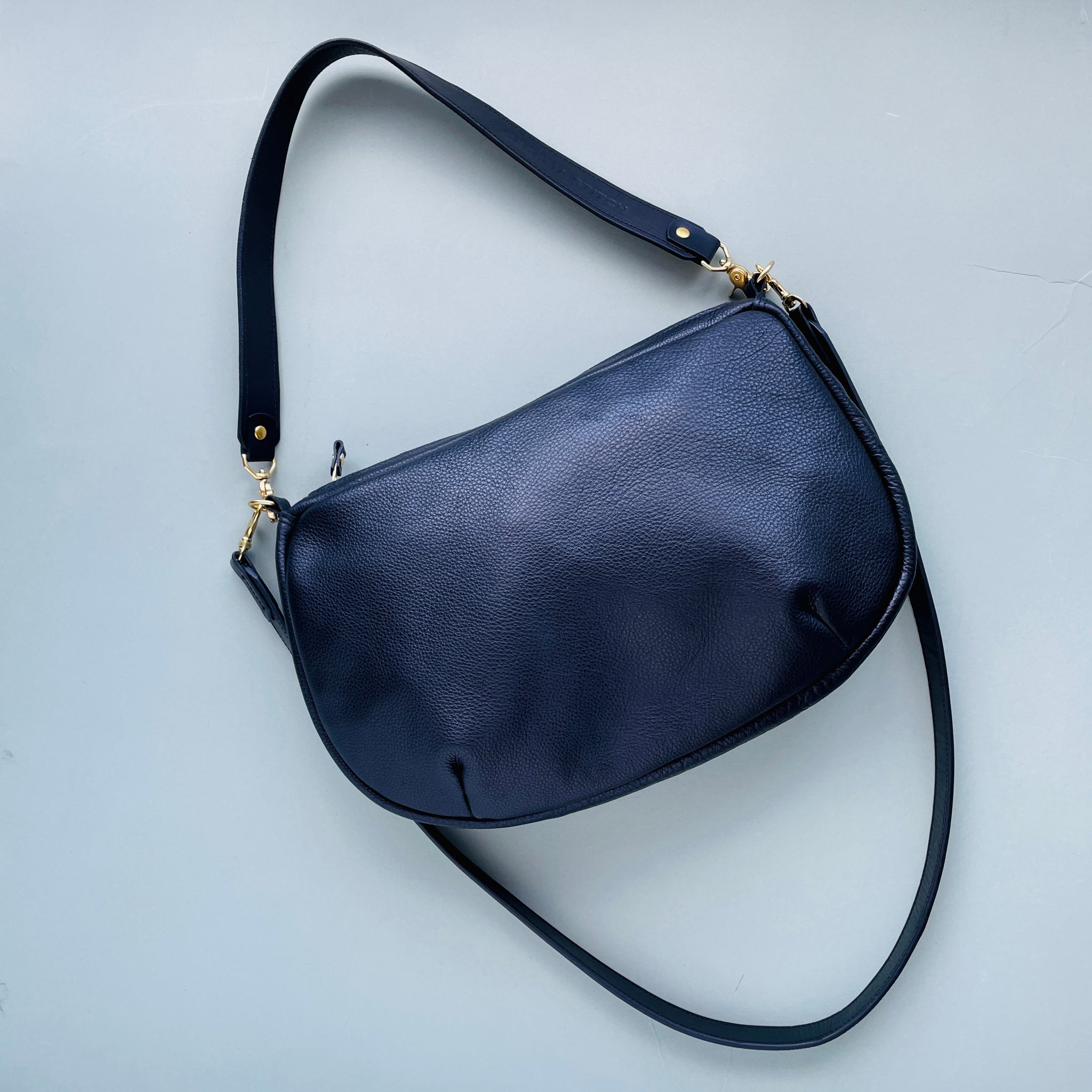 Equipped with a 43" crossbody strap and a 23”shoulder strap, meticulously made from Italian Pebble Grain leather in our Ballard studio.